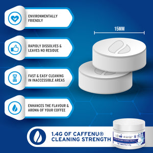 The Caffenu cleaning tablets are designed to remove old coffee grease and oils, residue, odours, and tannins that accumulate inside brewing units, pots, and filters. Its tough degreasing agent cleans coffee machines like no water or descaler solution can.